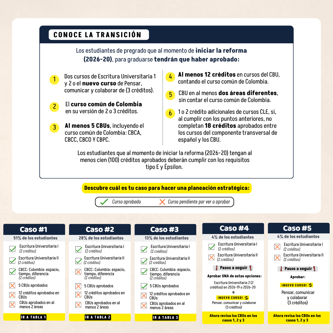 En el 2017 la Universidad de los Andes reformó el Ciclo Básico Uniandino (CBU). Aquí puede ver la transición hacia el nuevo CBU UNICAMENTE para estudiantes que entraron antes del 2018-2, que aprobaron al menos un curso del antiguo CBU y que no cumplen con el requisito del CBU que estaba vigente antes de la reforma de 2018-2